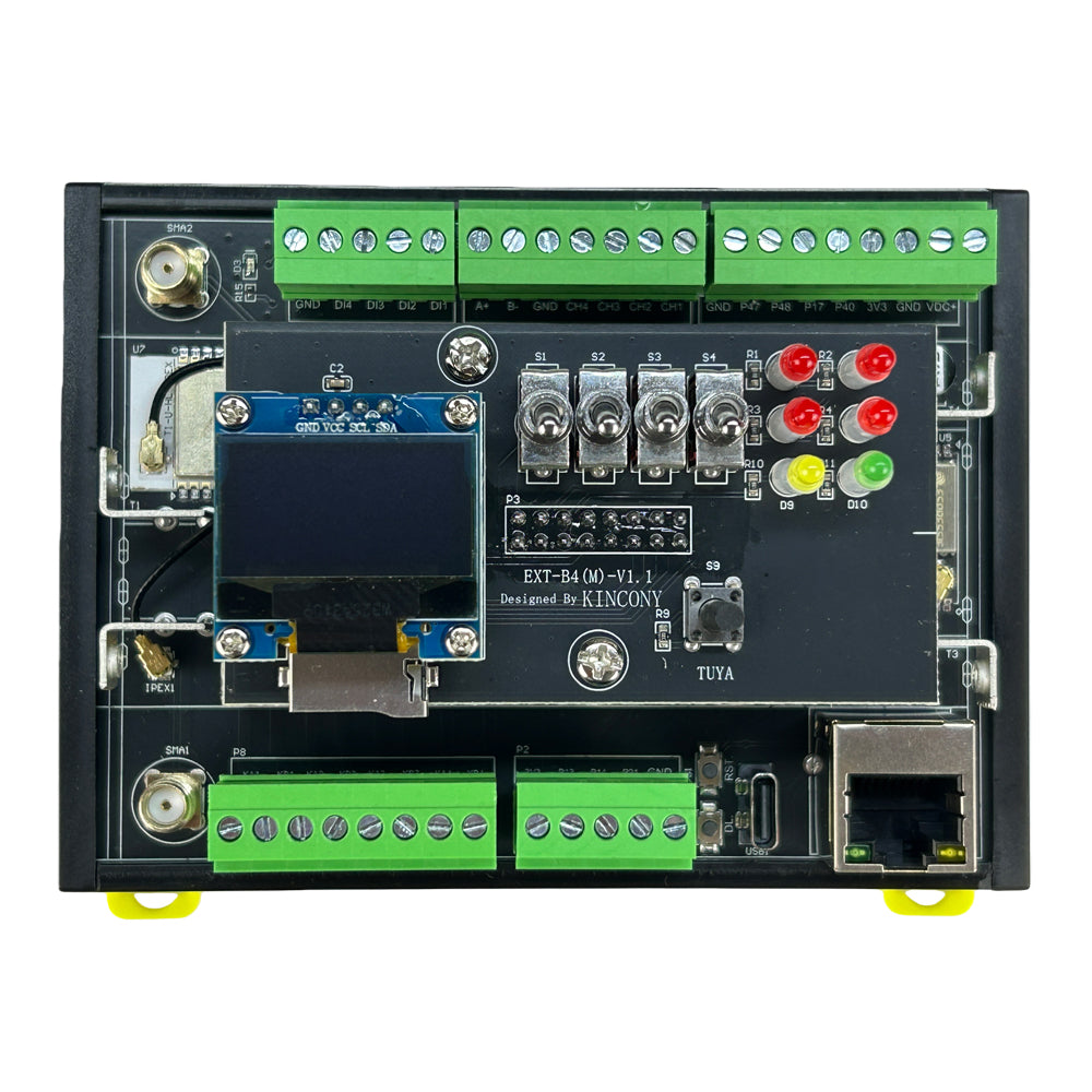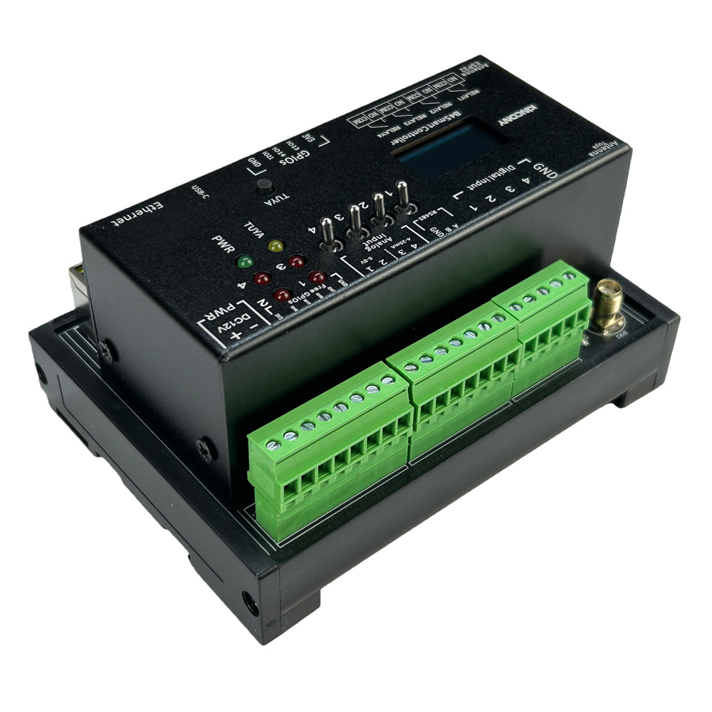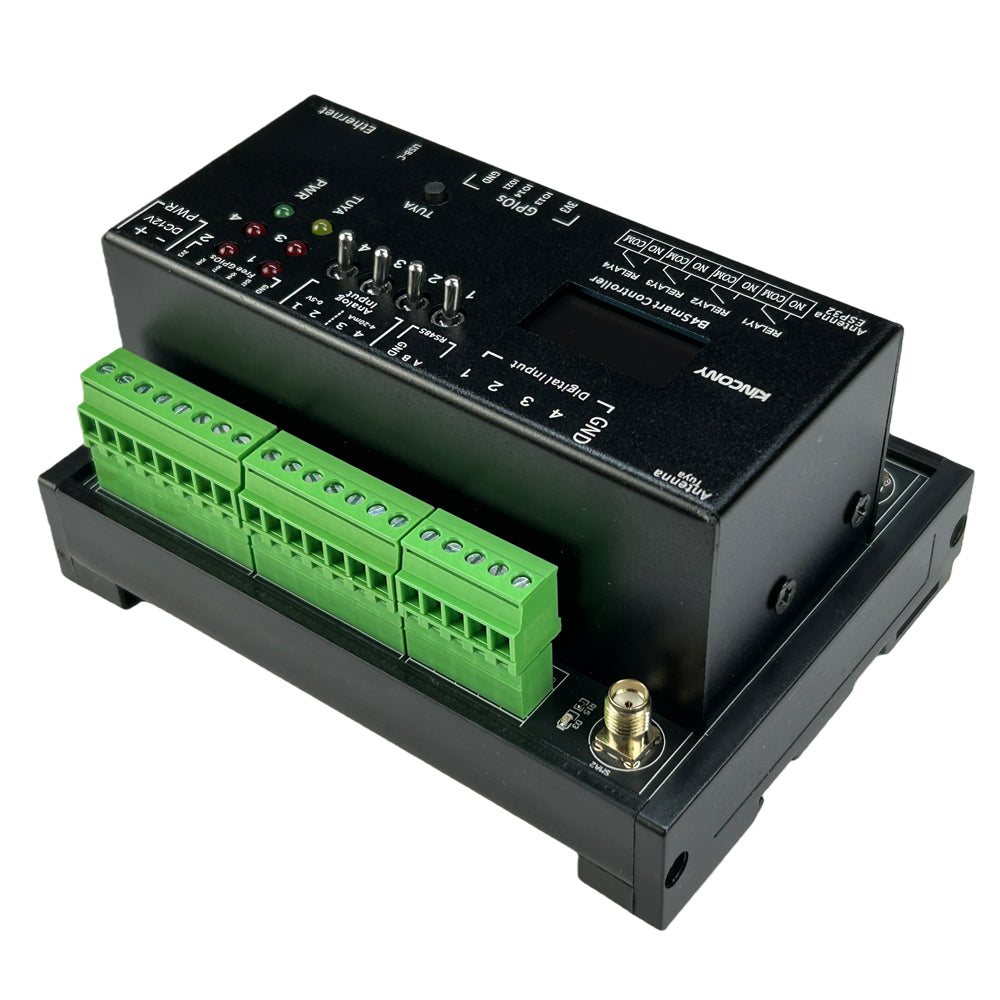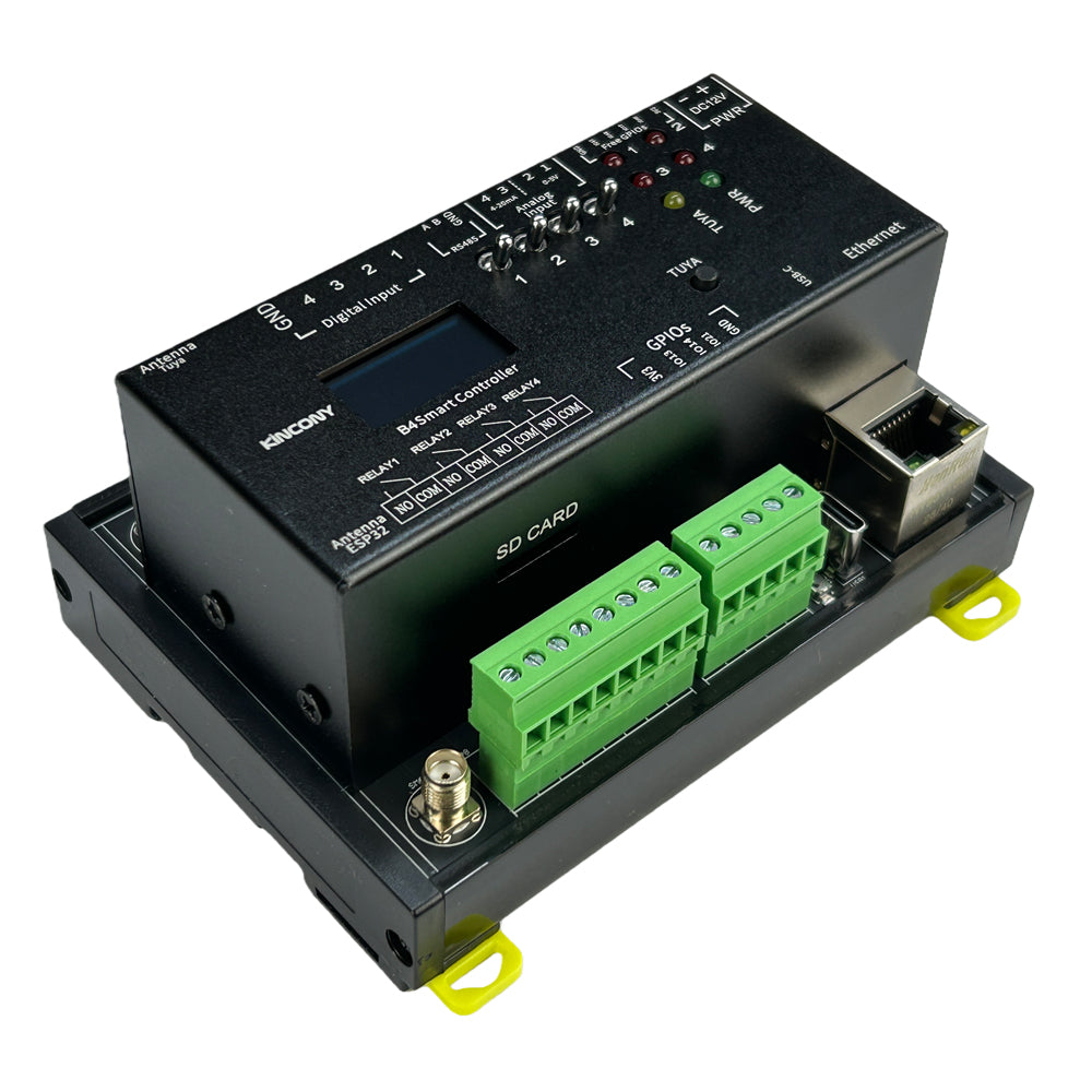 KinCony B4 ESP32 smart controller based on ESP32-S3-WROOM-1U (N16R8) wifi chip. Support 4 channel relay output, 7 channel 1-wire GPIOs, 4 channel ADS1115 16bit analog input ports. One SD card using SPI bus. B4 include DS3231 high precision RTC clock chip. LCD display will show wifi and ethernet IP address and Tuya connection state. B4 have I2C bus extender and RS485 port. You can write any code by Arduino IDE / MicroPython / ESP-IDF development tool to ESP32 module. We will supply Arduino / ESP-IDF demo code for different samples. Everyone can modify and change the code for your own smart home automation system project. it support use by ESPHome for home assistant or tasmota firmware for smart home automation DIY. B4 use KCS v3 firmware, it support home assistant auto discovery function by MQTT, so without write any config code (zero code) for home assistant. KCS v3 support KinCony cloud service (official shop customer free 2 years), remote monitor and control device by webpage in anywhere. KCS v3 support KinCony board integrate to Loxone Miniserver. Support Apple HomeKit for Siri.