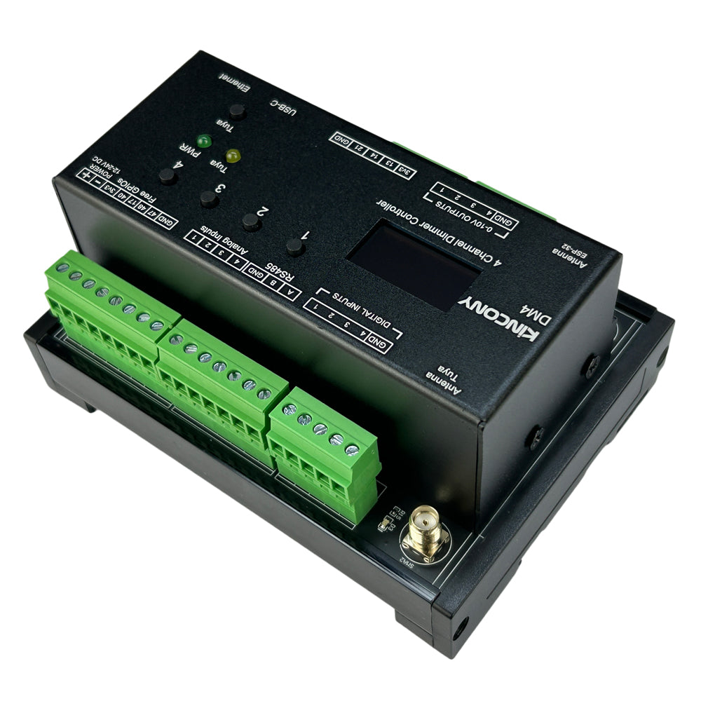 KinCony DM4 ESP32 smart dimmer controller based on ESP32-S3-WROOM-1U (N16R8) wifi chip. Support 4 channel DC 0-10v output, 7 channel 1-wire GPIOs, 4 channel ADS1115 16bit analog input ports. One SD card using SPI bus. DM4 include DS3231 high precision RTC clock chip. OLED display will show wifi and ethernet IP address and Tuya connection state. We will supply Arduino / ESP-IDF demo code for different samples. Everyone can modify and change the code for your own smart home automation system project. it support use by ESPHome for home assistant or tasmota firmware for smart home automation DIY. DM4 use KCS v3 firmware, it support home assistant auto discovery function by MQTT, so without write any config code (zero code) for home assistant. KCS v3 support KinCony cloud service (official shop customer free 2 years), remote monitor and control device by webpage in anywhere. KCS v3 support KinCony board integrate to Loxone Miniserver. Support Apple HomeKit for Siri.