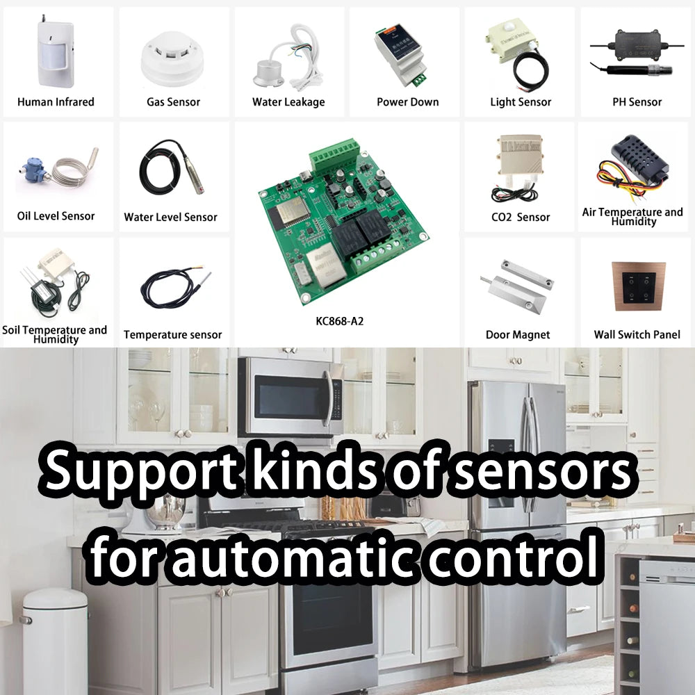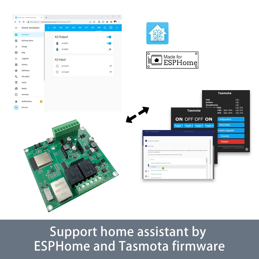 KC868-A2 esp32 4G relay board based on ESP32 wifi chip, many hardware resource for you to use. it support GSM module for SMS, voice call, GPRS communication. Support 4G SIM7600 module or 2G SIM800L module. Use SMS or call to turn ON/OFF relay will be very easy for home automation DIY. You can write any code by Arduino IDE to ESP32 wifi/bluetooth/ethernet RS485 module. We will supply demo code for different samples. Everyone can modify and change the code for your own smart home automation system project. it support use by ESPHome for home assistant or tasmota firmware for smart home automation DIY.