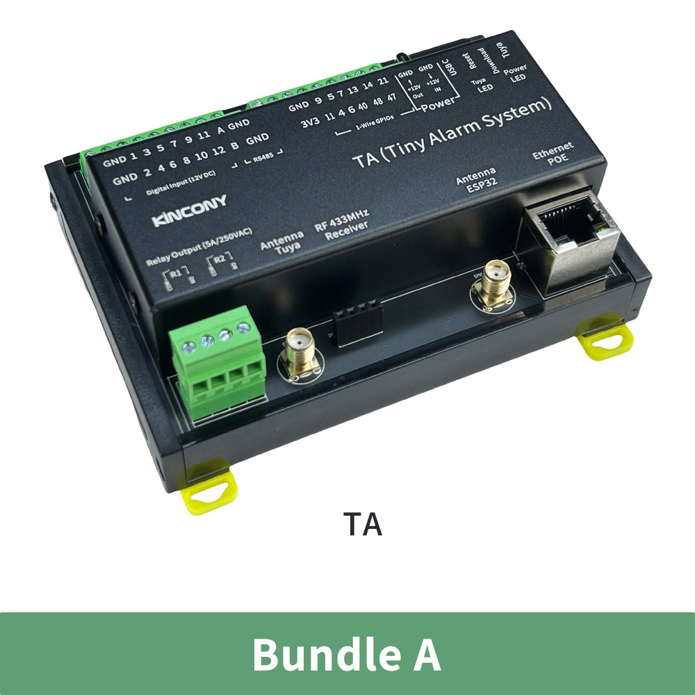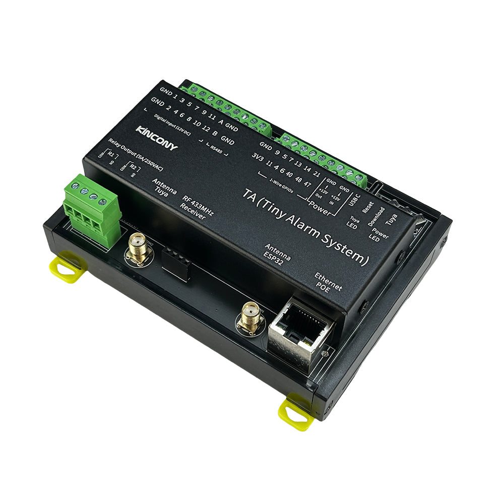 KinCony TA (Tiny Alarm System) ESP32-S3 smart controller based on ESP32-S3-WROOM-1U (N16R8) wifi chip and Tuya module. It have 12 channel digital input (12-zone) and 2 channel relay output for sirens or strobe lights, 12 channel 1-wire GPIOs, DS3231 high precision RTC clock chip.TA added Power over Ethernet (PoE). TA have RS485 port and RF433MHz RF receiver. You can write any code by Arduino IDE / MicroPython / ESP-IDF development tool to ESP32 module. We will supply Arduino demo code for different samples. Everyone can modify and change the code for your own smart home automation system project. it support use by ESPHome for home assistant or tasmota firmware for smart home automation DIY. TA use KCS v3 firmware, it support home assistant auto discovery function by MQTT, so without write any config code (zero code) for home assistant. KCS v3 support Apple HomeKit. Tuya mobile phone APP remote monitor 12 channel digital input port state, 12 channel temperature sensors and control 2 channel relay by internet.